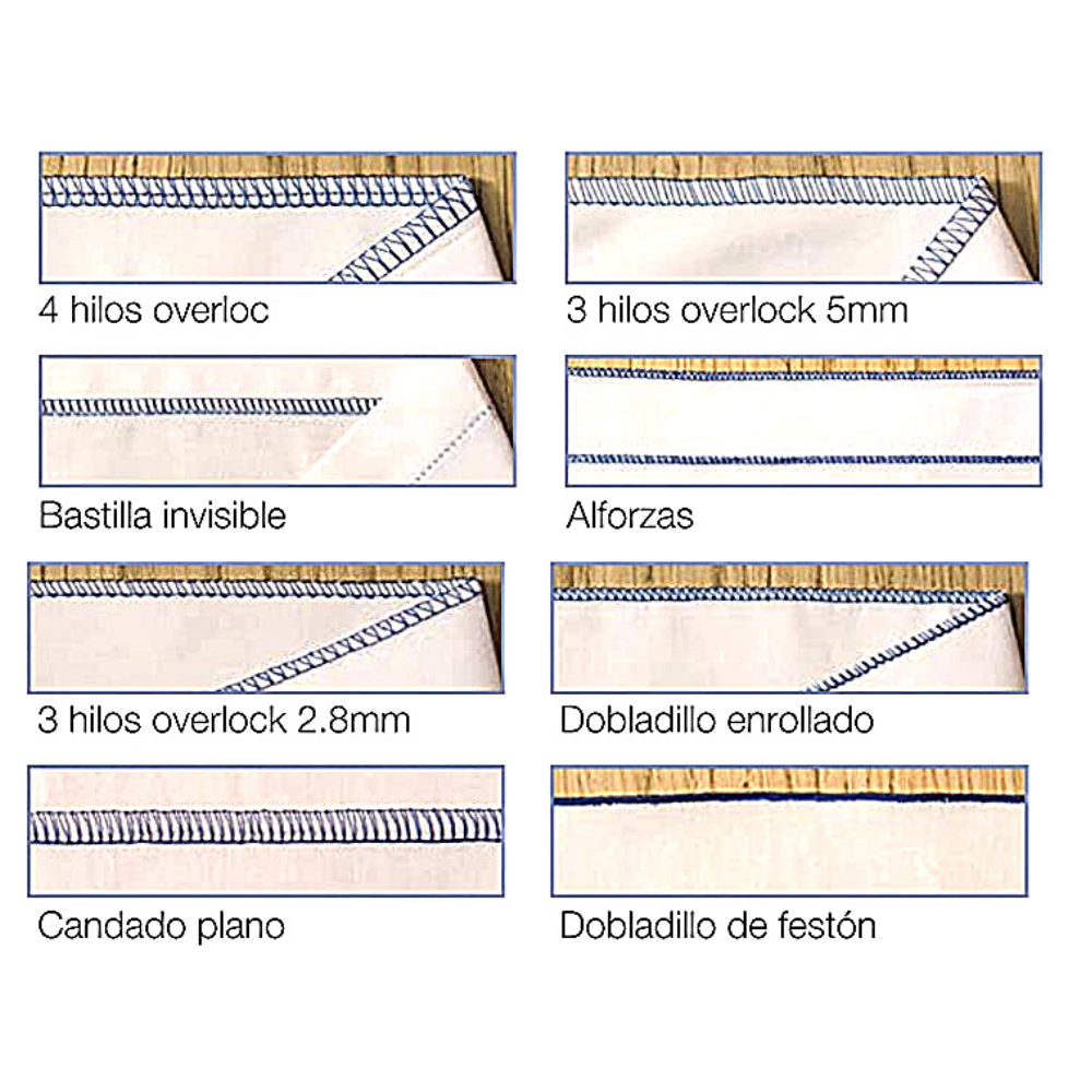 Puedes realizar diferentes tipos de puntadas : 4 hilos overlock, 3 hilos overlock 5 mm, Dobladillo invisible, 3 hilos overlock de 2.8 mm, Candado plano decorativo, plisado con unión de telas y Festón.